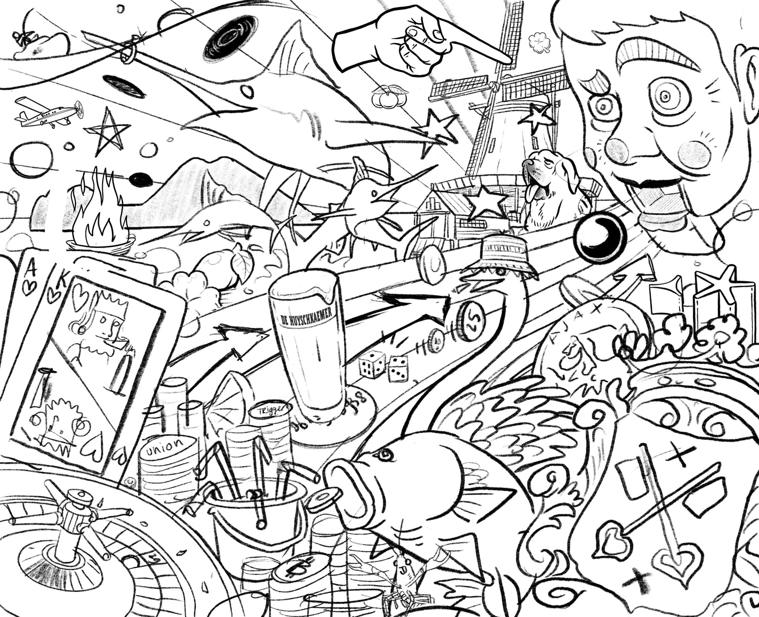 When I have all the information I start the sketching phase. I puzzle all the loose pieces together into a rough composition sketch.