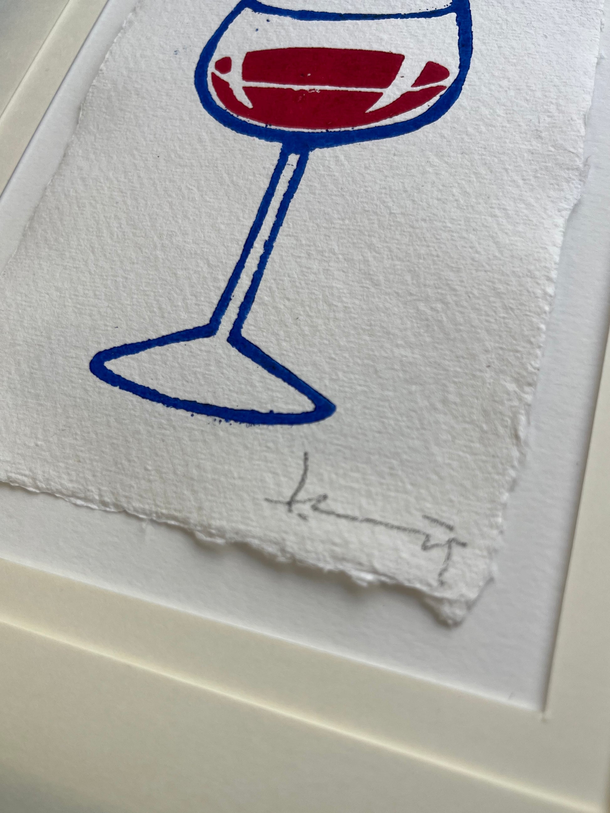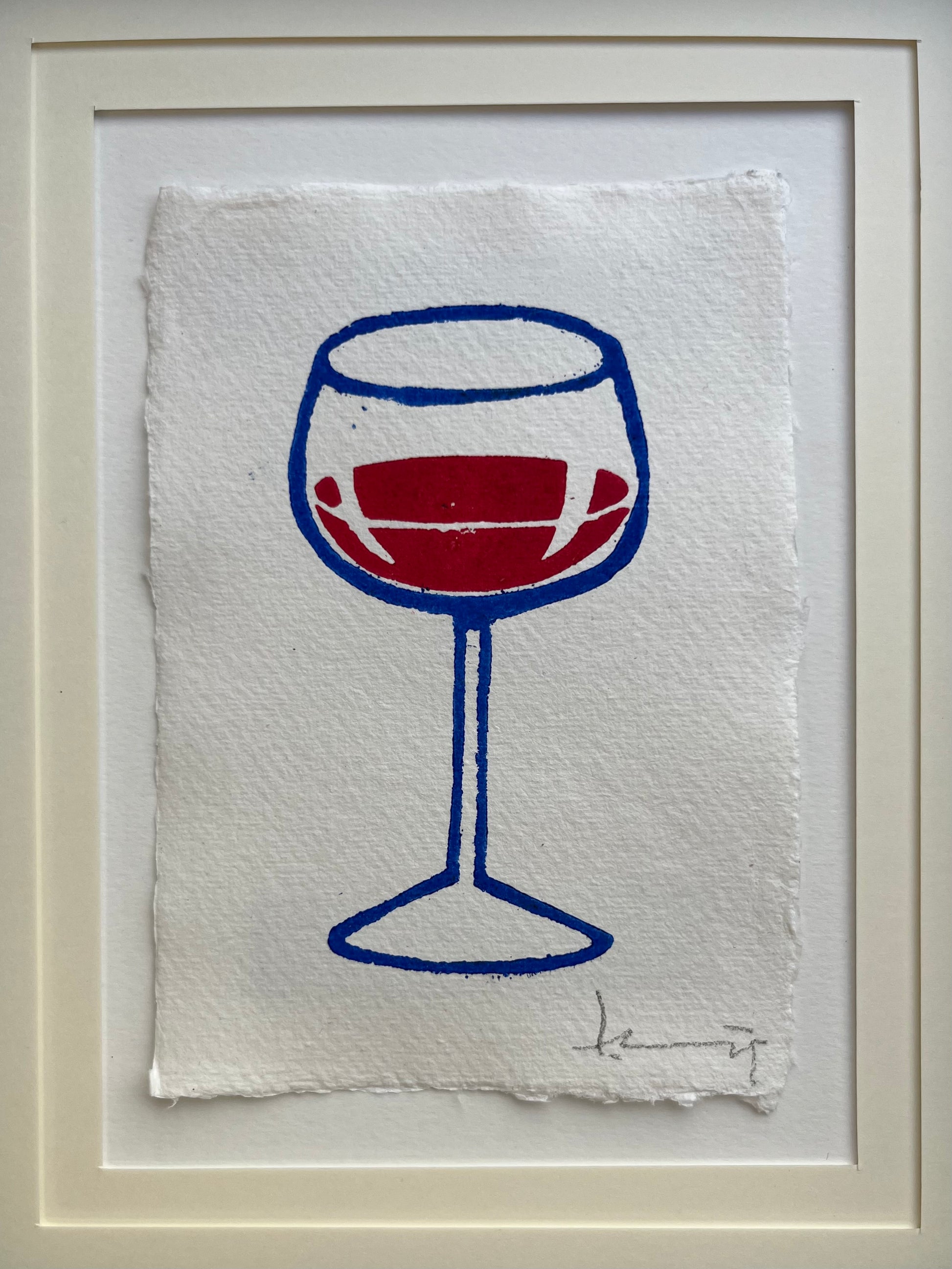 Dit gezellige glaasje wijn is een met handgemaakte linosnede.
